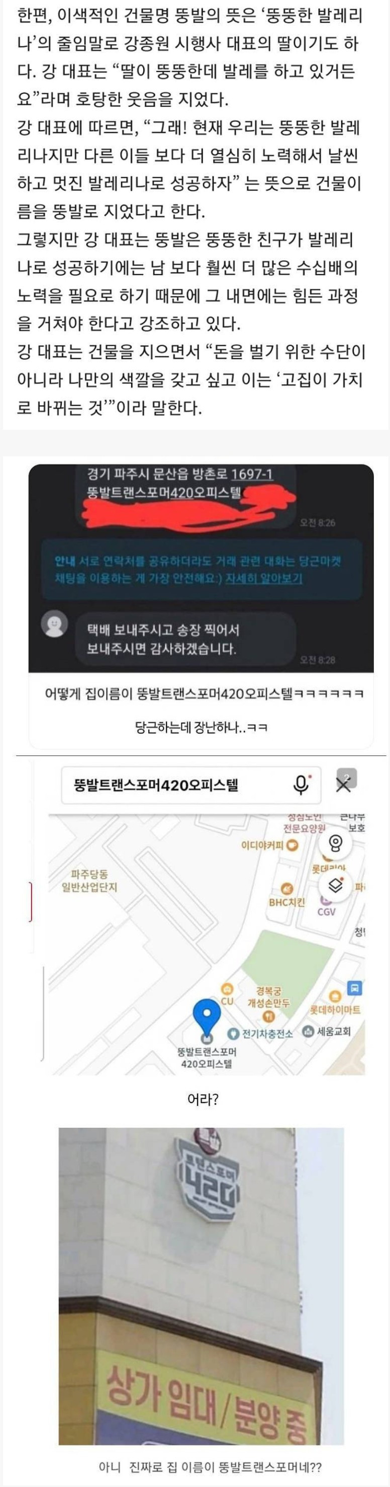 다시봐도 어이없는 건물이름 조회 0 | 댓글 0건 가비슈포댄서 2시간전 뚱발트랜스포머 딸이 뚱뚱한데 발레해서 뚱발 동네에 독을 뿌림 상가이름이 뚱발트랜스포머라 뚱발 부동산 뚱발 미용실 이런식으로 가게들이 입점함 0