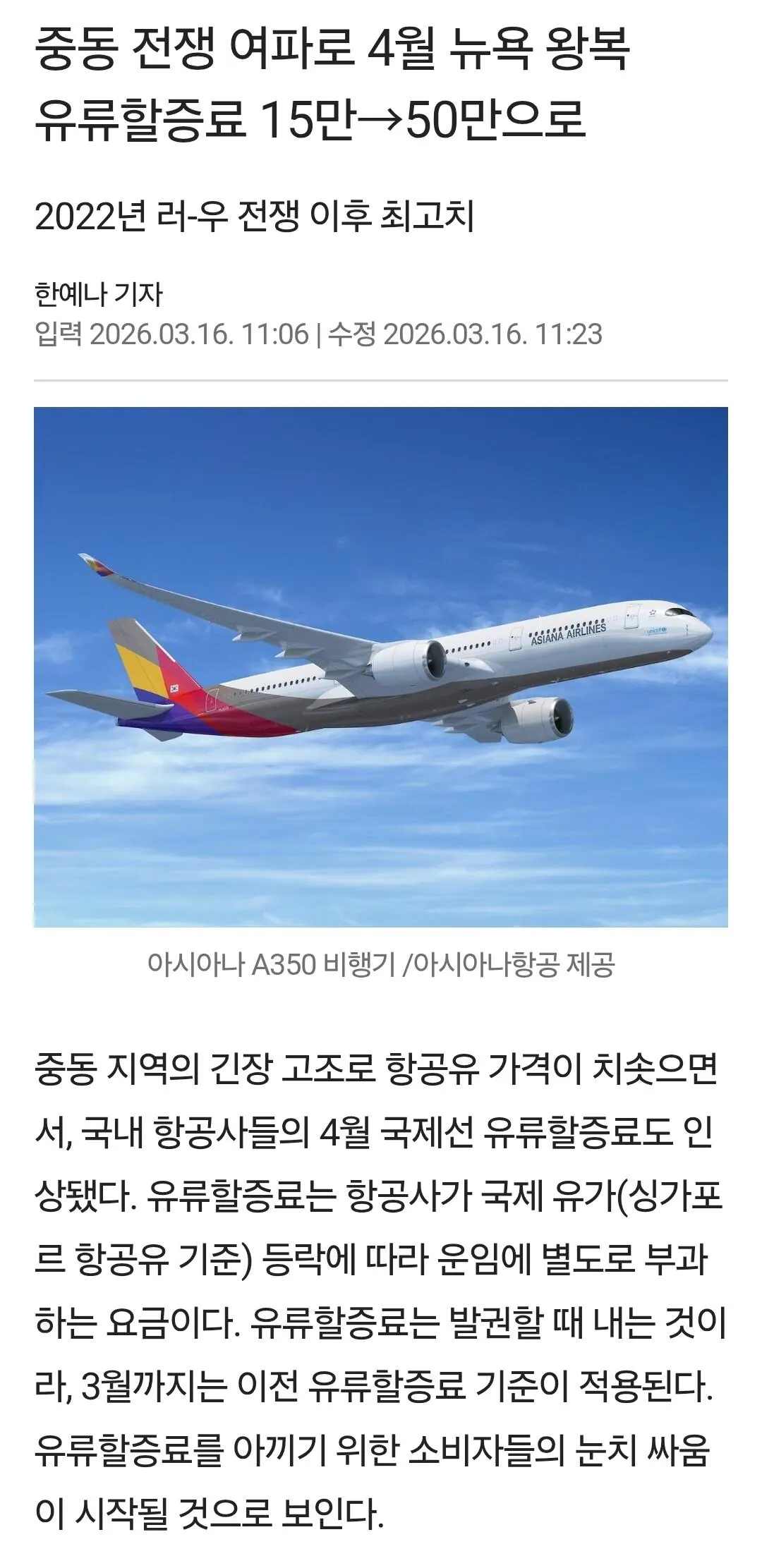 중동 전쟁 여파로 4월 뉴욕 왕복 유류할증료 15만→50만으로