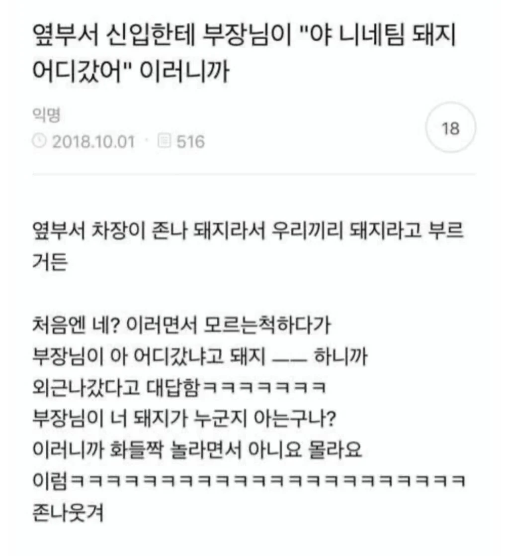 신입한테 부장님이 "야 니네팀 돼지 어디갔어" 이러니까