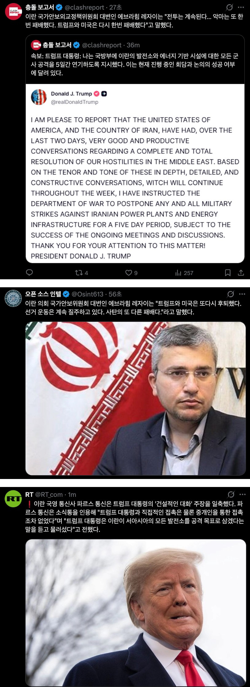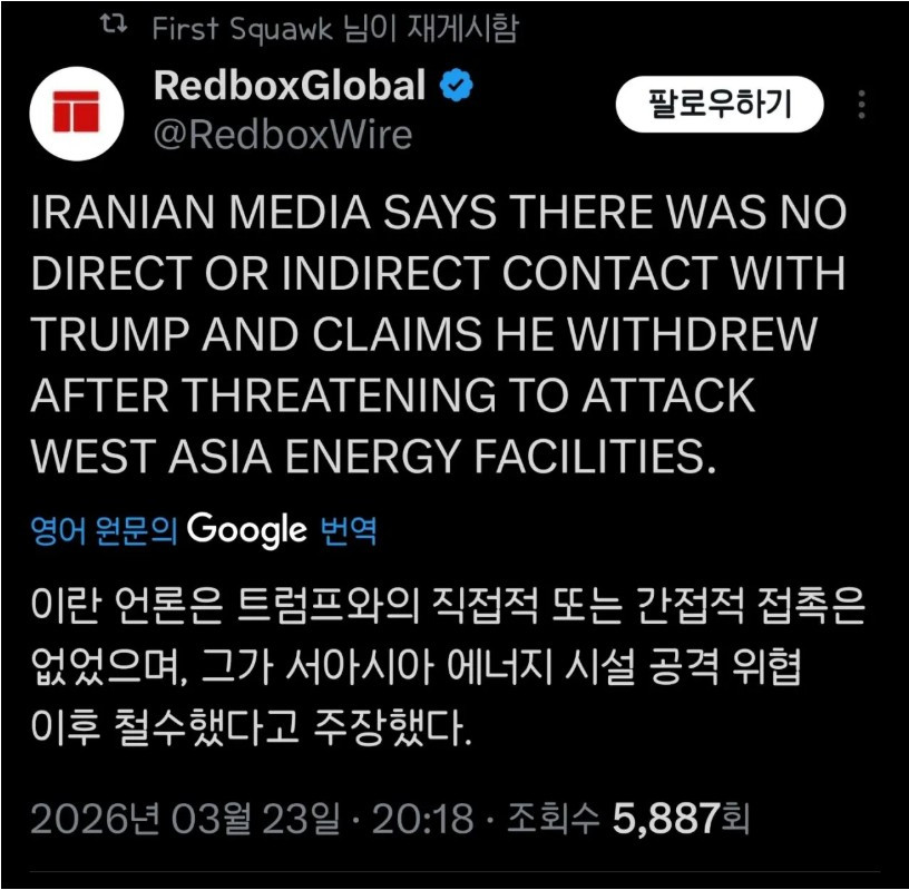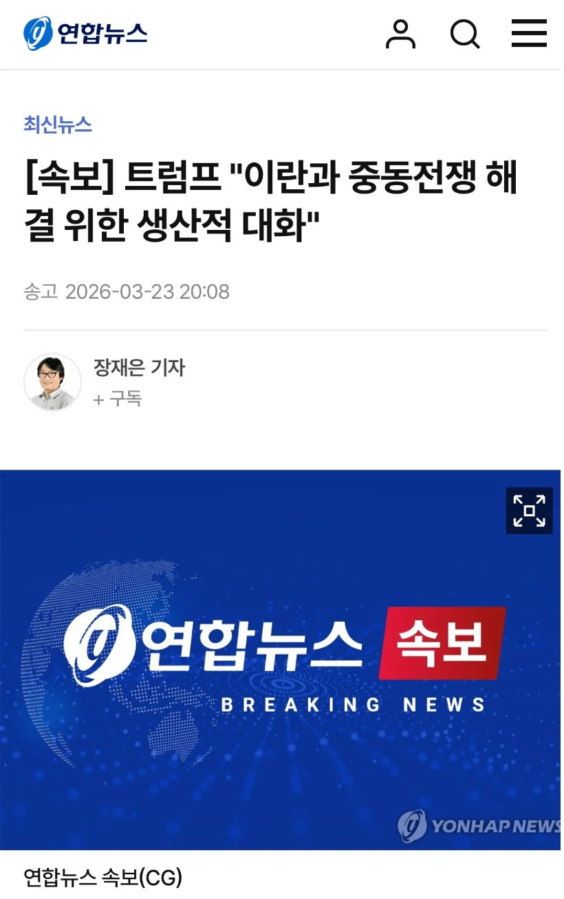 트럼프 "이란과 협상하겠다" 조회 0 | 댓글 0건 갓파 4시간전 https://www.yna.co.kr/view/AKR20260323163700009 이란 "접촉한 적 없다" 이란 "어 전쟁 안끝나" 0