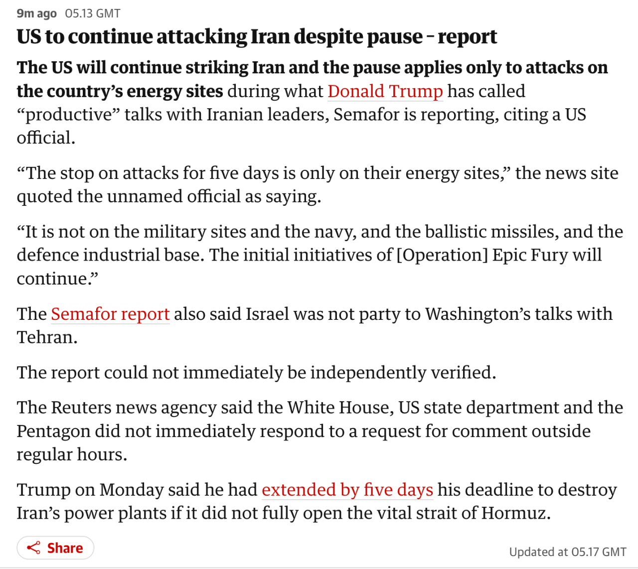 [가디언] 도널드 트럼프 대통령이 이란 지도부와의 대화가 "생산적"이라며 공격 중단(일시 정지)을 발표했으나, 이는 오직 이란의 '에너지 시설'에만 해당한다고 세마포르가 미 정부 관계자를 인용해 보도했습니다.