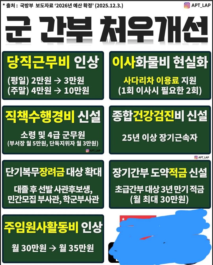 2026년 달라진 군 간부 처우 근황 조회 0 | 댓글 0건 더한마음 2시간전 간부들 급여는 하사들 근무시간 기준으로 따져보면 아직도 심각한 수준이네요저거 시간당 8천원은 되려나요? 0